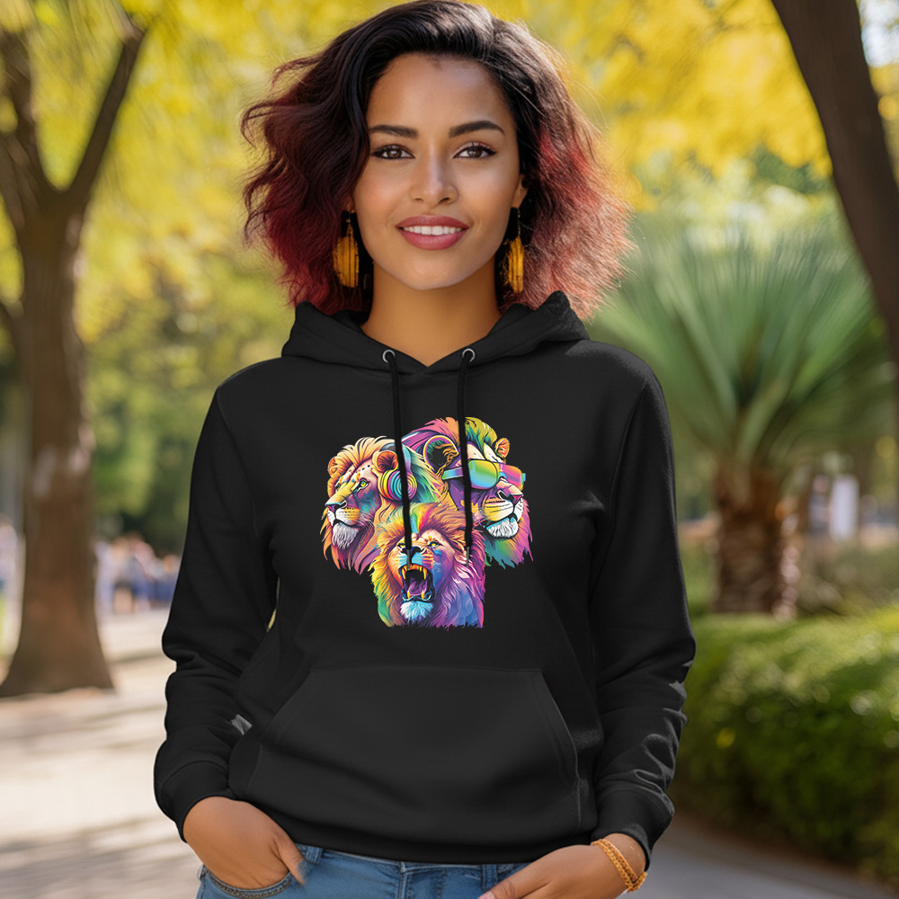 Lion heads: Hear (headphones), See (sunglasses), Talk (open mouth)